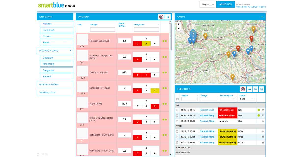 Unter dem Lable PV-Care überwachen wir unsere eigenen sowie fremde PV-Anlagen. Dazu setzen wir den Leitstand smartblue ein. Die permanente Überwachung der Stromproduktion, die sog. technische Betriebsführung, deckt Mängel auf und bietet Ihnen eine langfristige Ertragssicherheit.